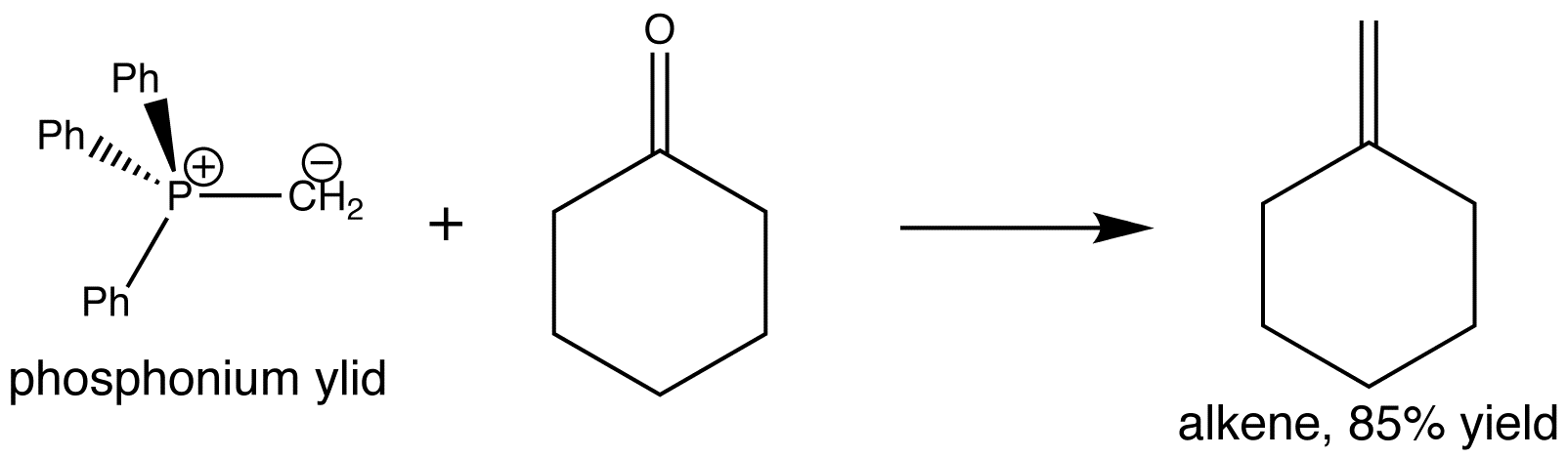 Below is an example of a typical Wittig reaction. The phosphonium ylid is treated with the carbonyl compound (cyclohexanone) to give the alkene in 85% yield. ‘Click’ on the image below to view the 3D mechanism for the formation of the alkene: