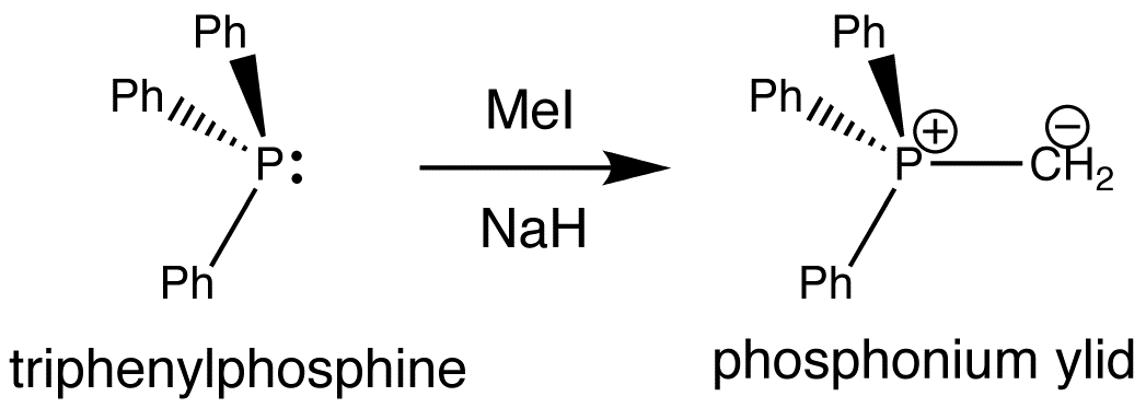 The Wittig reaction is the overall substitution of a C=O bond to a C=C bond. It is a reaction between a cabonyl compound (aldehyde or ketone only) and a species known as a phosphonium ylid. An ylid is a species with a positive and negative charges on adjacent atoms. A phosphonium ylid carries its positive charge on phosphorus. ‘Click’ on the image below to view the 3D mechanism for the formation of one such phosphonium ylid: